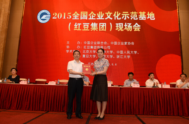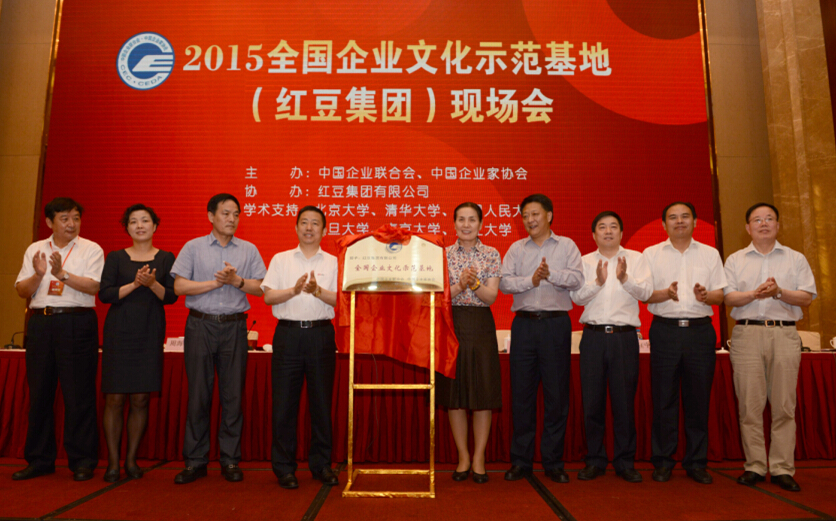 6月6日,中国企业联合会在无锡召开2015全国企业文化(红豆集团)现场会,授予红豆集团有限公司“全国企业文化示范基地”称号。中国企业联合会、中国企业家协会驻会副会长尹援平,国务院国资委研究局副局长、行业协会办副主任张涛,江苏省工商联副主席姜成林,无锡市副市长曹佳中,中国企业联合会、中国企业家协会常务副理事长于吉,红豆集团党委书记、总裁周海江,无锡市委宣传部副部长商波涛,清华大学教授、博士生导师邹广文,锡山区委常委、宣传部部长窦虹出席会议并为全国企业文化示范基地揭牌。