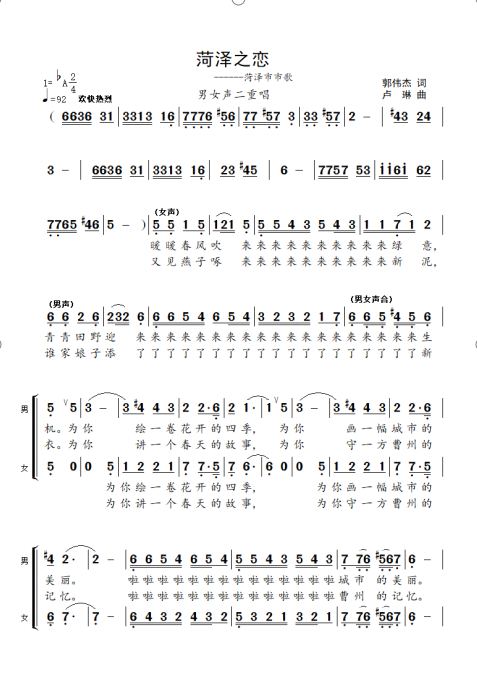 地方民歌《菏泽之恋》这首歌曲郭伟杰作词,卢琳作曲,采用了山东菏泽地区的民歌曲调,捕捉菏泽的民俗文化,展示一花一城的地方特色,讴歌家乡的幸福生活,让世界听到菏泽蓬勃发展的声音。