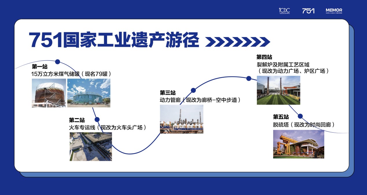 本次授牌仪式首次发布了“751国家工业遗产游径”,本条游径以751园区国家工业遗产核心物项为主线,包括1#15万立方米煤气储罐(现名79罐)、火车专运线(现改为火车头广场)、动力管廊(现改为廊桥-空中步道)、裂解炉及附属工艺区域(现改为动力广场、炉区广场)、脱硫塔(现改为时尚回廊);游径同时包涵含751园区内举办的重要国内外时尚文化活动,从而形成旅游、教育、休闲一体化的工业遗产活化利用新模式。