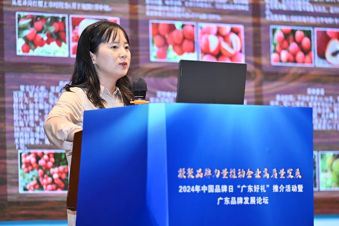 在“广东好礼”品牌建设经验分享环节,广州从化华隆荔枝产业研究院实验中心主任温冰怡以《培育荔枝新品质带动全产业链发展》为题,介绍了公司在荔鼎生态、华隆生鲜、炫光食品三大业务板块和省级工程中心科研平台的发展情况,展示了公司在荔枝品种选育、高效栽培、数字农业、采后保鲜和食品加工全产业链中所发挥的农业龙头企业及高新技术企业的丰硕成果。