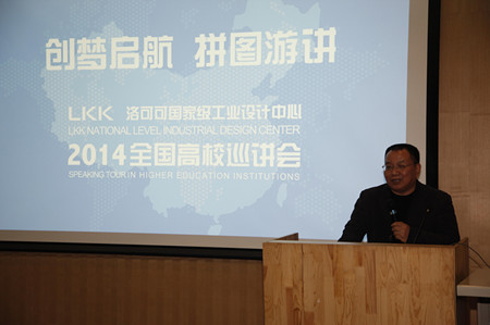 中国著名设计师、LKK洛可可创始人贾伟致开场辞。他说“推进文化创意和设计服务与相关产业融合发展,大力扶持文化创意和设计服务人才已经上升到国家战略。LKK洛可可一向重视创新设计人才培养和公益教育,2013年底基于国家级工业设计中心的未来建设就提出“221”工程战略构架,其中人才战略是该架构的重中之重。恰逢10周年之际,我们整合集团优势资源和设计师力量,推出全国高校巡讲会,旨在为培养创新设计型人才和应用型人才贡献一份力量,为“中国制造”向“中国智造”的转变提供强有力的人才支持。”