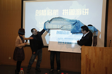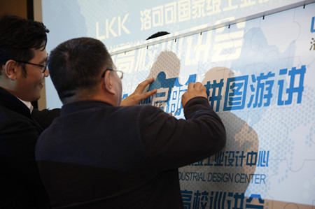 会上,启动仪式别具特色。在振奋人心的音乐中,许平院长与贾伟先生共同为全国高校巡讲会版图揭幕。版图的底图由60块拼图组成,蓝白相见,简约大气。许平院长与贾伟先生分别将一块带有“启”字和“ 航”字的拼图拼接在底图上面,点亮整个版图,象征着以“创梦启航,拼图游讲”为主题的全国高校巡讲会正式开启!与此同时,巡讲同期的线上有奖参与活动也在LKK洛可可官方微博微信同步展开,面向全国的设计学生和创意爱好者征集主题创意视频,意在掀起全国创意热潮,引发国人对原创的新一轮重视与参与。
