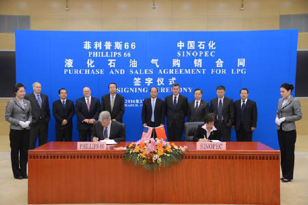 中国石油化工股份有限公司全资子公司——中国国际石油化工联合有限责任公司(联合石化)与美国菲利普66公司在北京中国石化总部,举行丙烷长期购销合同签字仪式。中国石化股份公司高级副总裁戴厚良和美国菲利普66公司执行副总裁蒂姆·泰勒先生出席签字仪式。联合石化是中国最大的国际贸易公司,经营范围包括原油贸易、成品油贸易、LNG贸易、化工原料贸易及仓储物流等国际石油贸易业务。